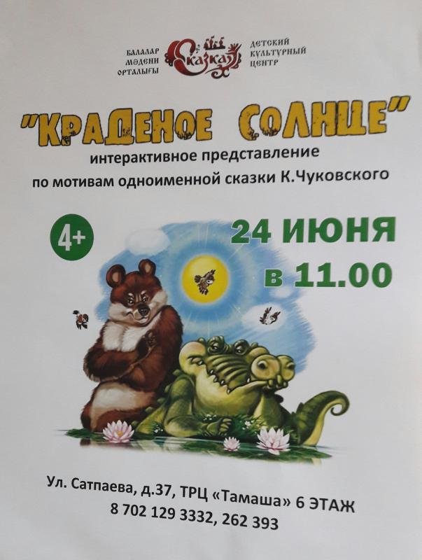Приглашаем всех малышей и их родителей на интерактивное представление по мотивам одноименной сказки К.Чуковского "Краденое солнце"