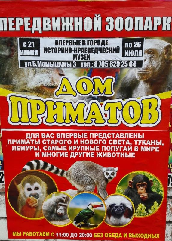 Впервые в городе с 21 по 26 июня в историко-краеведческом музее города Атырау, будут выступать передвижной зоопарк "Дом приматов". Для вас впервые представлены приматы старого и нового света, туканы, лемуры, самые крупные папугай в мире и многие другие животные. Мы работаем с 11:00 по 20:00 по адресу ул. Б.Момышулы 3. Тел: 8 705 629 25 64.