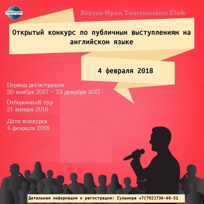 Открытый Клуб Тоастмастерс Атырау объявляет регистрацию на конкурс! На февраль 2018 года запланирован первый в истории клуба конкурс мастеров публичных выступлений! Конкурс состоится 4 февраля 2018. Преквалификация - 21 января 2018. Для участия в конкурсе необходимо зарегистрироваться до 23 декабря. Контакты для регистрации Мира +77027366051, Герман +77051246768. Ранее в августе текущего года мы писали про Открытый Клуб Тоастмастерс Атырау, когда ребята провели Вечер Поэзии. Каждый понедельник проводятся собрания клуба, где каждый желающий может участвовать в качестве спикера, развивать в дружеской атмосфере навыки публичного выступления и лидерские качества!
